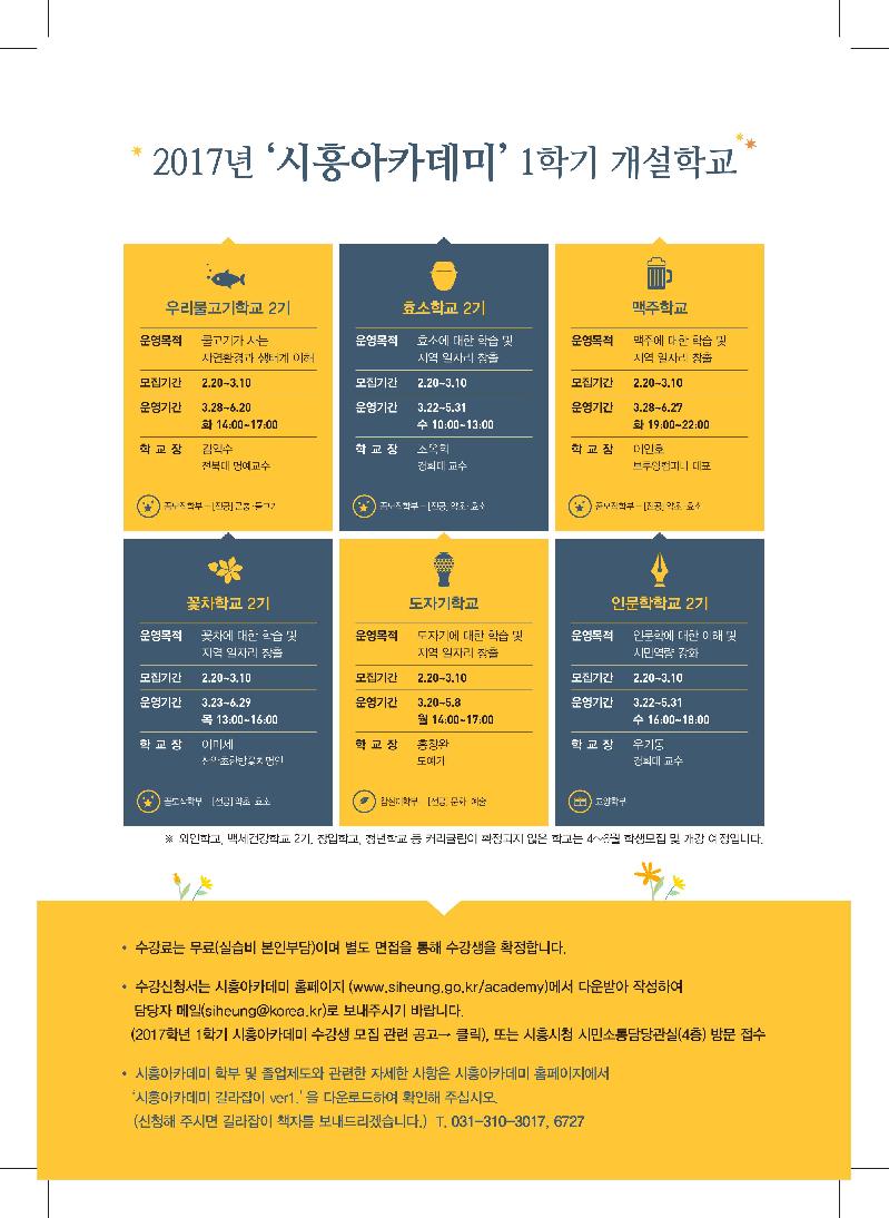 [미디어타임즈= 신정식 기자] 시흥아카데미는 3월 10일까지 2017년 1학기 개설학교 수강생을 모집한다.