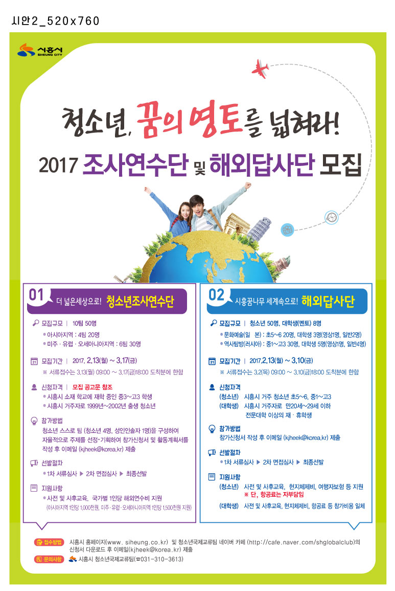 [미디어타임즈= 신정식 기자] 시흥시는 관내 청소년들의 국제적인 역량을 강화하고 글로벌 리더로서의 성장을 지원하고자 2017년「더 넓은 세상으로! 청소년조사연수단」과「시흥꿈나무 세계 속으로! 해외답사단(문화예술, 역사탐방)」에 함께 할 청소년을 모집한다.