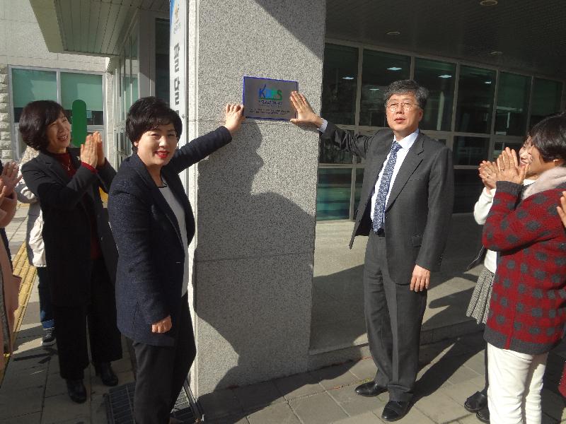 | 이희옥 팔달구 보건소장과 성빈센트병원 의무원장 안유배 교수가 현판식 후 기념 촬영을 하고 있다. |
