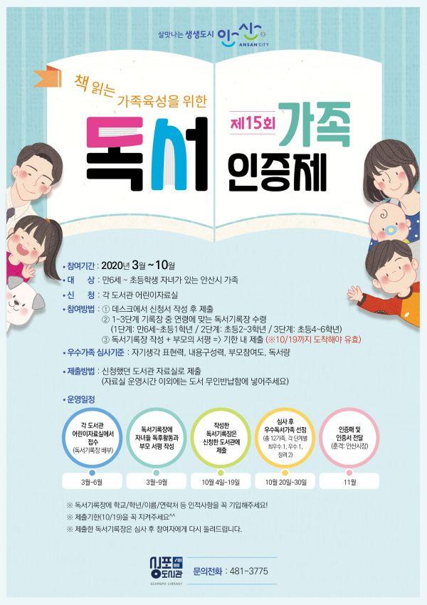 독서가족인증제는 부모와 자녀가 함께 책을 읽고 독서기록장을 작성하는 가족독서프로그램으로 다음달 2일부터 안산시 각 도서관 어린이자료실에서 신청할 수 있다.