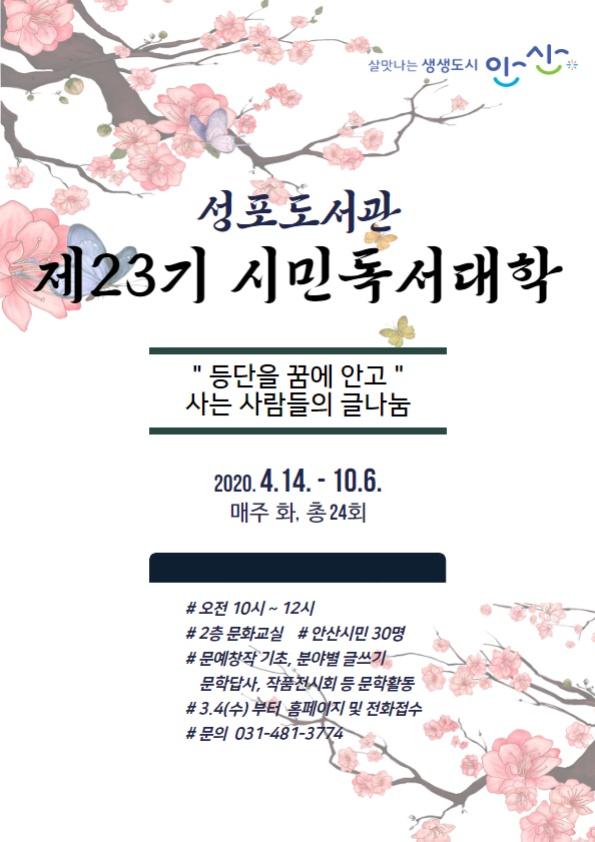안산시 성포도서관은 시민들의 꾸준한 독서활동과 지식 충전의 기회를 제공하기 위해 정기문학 강좌 제23기 시민독서대학 기초반 수강생을 다음달 4일부터 모집한다고 24일 밝혔다.