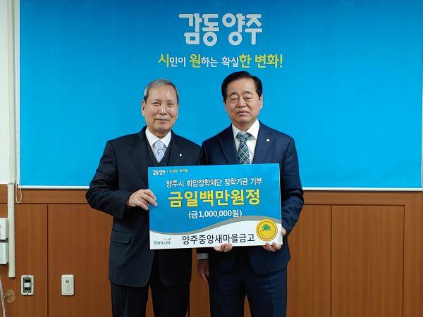 양주시 희망장학재단은 지난 21일 광적면 소재 양주중앙새마을금고에서 장학금 1백만원을 기부했다고 밝혔다.