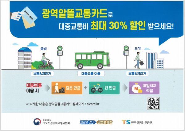 국토교통부가 주관하는 광역알뜰교통카드 사업은 대중교통 이용 시 보행이나 자전거 이용 거리만큼 마일리지를 적립해, 교통 요금에서 마일리지를 활용해 할인 받을 수 있는 사업이다.