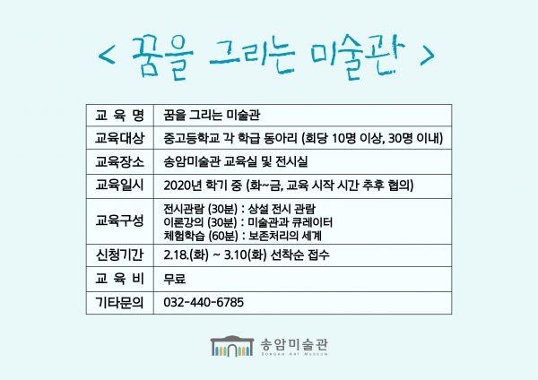 인천시 송암미술관에서는 지난 18일부터 오는 3월 10일까지 초등학교 단체프로그램 ‘알송달송 미술관’과 청소년 진로프로그램 ‘꿈을 그리는 미술관’에 참가할 초·중·고등학교 단체를 선착순으로 모집한다.