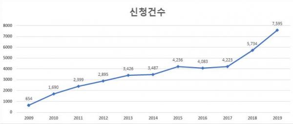 도입초기 654건에 불과하던 우선심사신청은 지속적인 증가세를 보이다가 최근 2018년 5,734건, 2019년 7,595건으로 크게 증가해 제도 도입 10년 만에 12배 가까이 급증했다.
