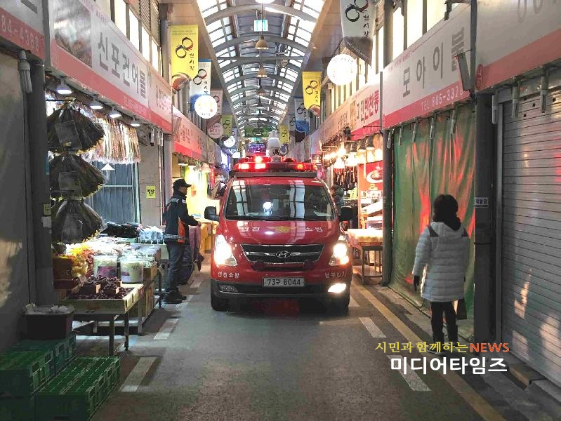 | 인천남부소방서 전통시장 소방차 출동로 확보훈련모습. <ⓒ미디어타임즈> |