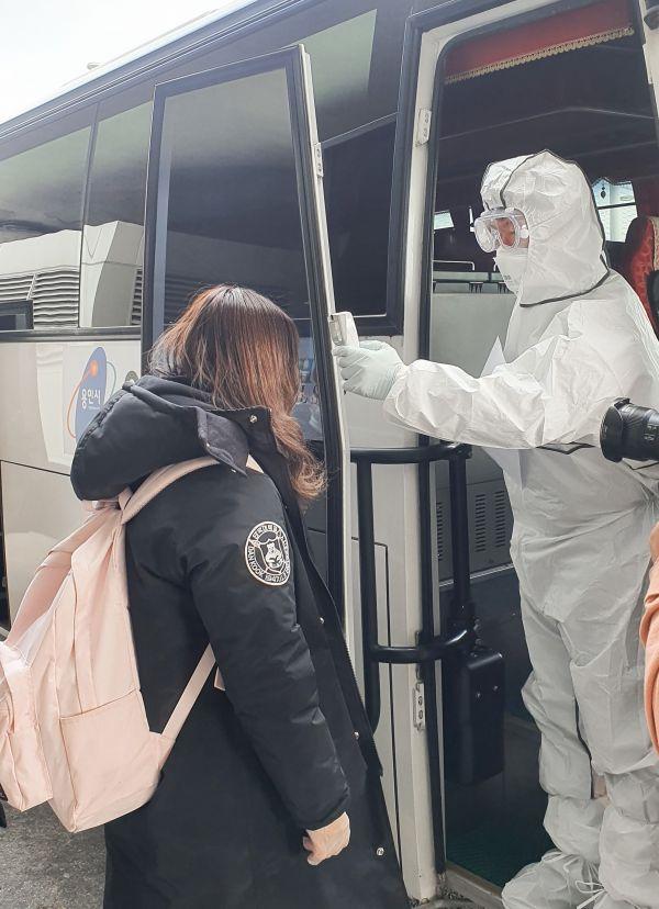 24일 인천국제공항으로 입국한 중국인 유-학생들이 단국대 죽전캠퍼스로 기숙사로 이동하기 위해 용인시가 준비한 수송 차량에 타고 있다.