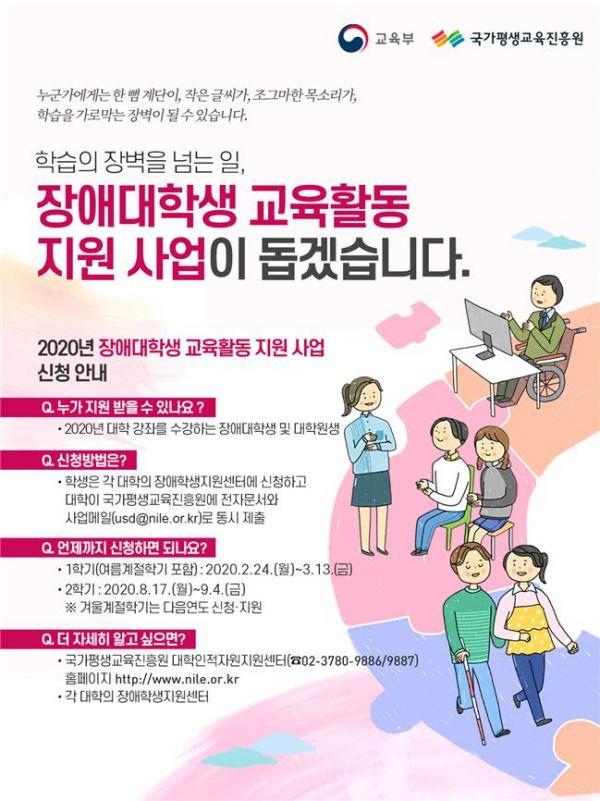 교육부와 국가평생교육진흥원은 지난 24일부터 오는 3월 13일까지 2020년도 장애대학생 교육활동 지원 사업 1학기 신청을 받는다.