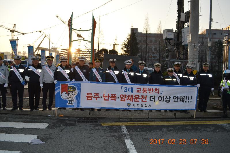 [미디어 타임즈 = 최귀복 기자] 거제경찰서(서장 김주수)에서는 23일 아침, 조선소 출근시간대에 맞춰 거제시 아주동 대우조선해양 서문 앞 등 8개소에서 3대 교통반칙 근절과 교통안전선 지키기 캠페인을 실시했다.이번 캠페인에는 경찰, 시청, 모범운전자회, 녹색어머니회와 자녀, 자율방범대, 여성명예경찰, 안전지킴이, 선진질서확립추진위원, 생활안전협의회 등 경찰협력단체와 양대 조선소 임직원 등 200여 명이 참가하였으며, 출근길 근로자와 운전자 등을 상대로 함께 시민들 안전을 위협하는 3대 교통반칙인 음주, 난폭・보복, 얌체운전 근절과 함께 지켜야 할 교통안전선(정지선, 중앙선, 지정선 등) 등 교통문화 의식개선을 집중 홍보했다.김주수 경찰서장은 이번 캠페인을 접한 많은 조선소 근로자와 차량 운전자들에게 올바른 교통문화정착에 도움이 되고 또 나아가 주변사람들에게 전파된다면 교통사고예방에 큰 도움이 될 것이라며, 차후에도 지속적으로 교통안전캠페인을 실시할 것이라고 하였으며 특히, 봄방학을 맞아 캠페인에 참여한 녹색어머니회 자녀들에게는 어린이 교통안전 전도사 역할을 해 줄 것을 주문하기도 했다.