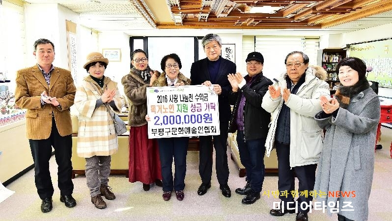 [미디어타임즈=문상수 기자] 부평구문화예술인협회는 23일 오후 홍미영 부평구청장 집무실을 방문, 불우이웃돕기 성금 200만원을 기탁했다.이 성금은 지난해 연말 사랑 나눔 전을 통해 얻은 수익금으로, 부평구 관내 독거노인 생계비 지원 사업에 쓰이게 된다.부평구문화예술인협회는 그동안 경제적으로 어려움을 겪고 있는 사회적 약자에 대한 지원 사업을 지속적으로 이어오고 있으며 최근에는 다문화 결혼이민여성 고향보내기 사업을 벌였다.권순식 부평구문화예술인협회장은 “지역 예술인들이 참여와 나눔을 통해 소외 계층이 행복한 부평구를 만들어 나가는데 지속적으로 앞장서 나가겠다”고 밝혔다.
