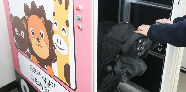 의왕시 내손2동 아동도서관에 설치되어 있는 유모차 살균기를 이용해 시민이 유아용 유모차를 살균하고 있다.