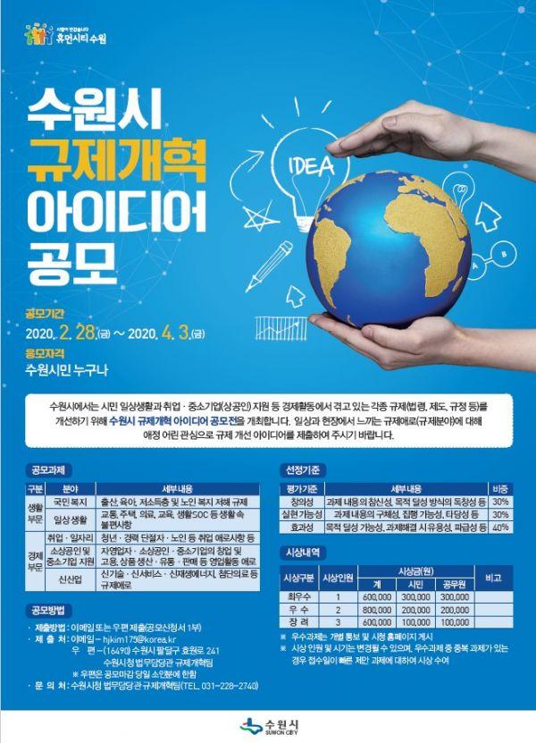 수원시는 오는 28일부터 4월3일까지 ‘2020 수원시 규제개혁 아이디어 공모’를 진행한다.