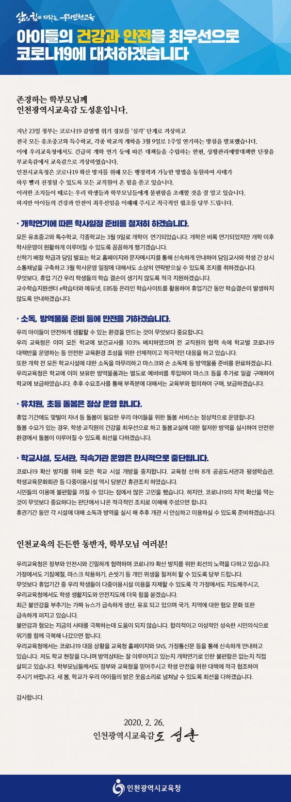 도성훈 인천광역시교육감이 26일 개학연기에 따른 교육청 대책을 안내하고 학생 안전을 위해 학부모와 시민의 적극적인 협조를 당부하는 내용의 담화문을 발송했다.