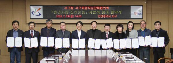 인천 서구는 지난 24일 지속가능한 클린도시 구축을 위한 ‘2020 서구 환경사랑 실천운동’이 성공적으로 추진될 수 있도록 서구 위생직능단체협의회와 자발적 참여 업무 협약을 체결했다.