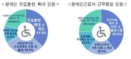 이 외에도 중증장애인근로자를 도와주는 장애인근로지원인과 장애인 보조기기의 지원 강화와 개선을 요구하는 내용이 20.4%, 임금체불·부당해고·과다노동 등에 따른 신고성 민원이 15.3%를 차지했다.