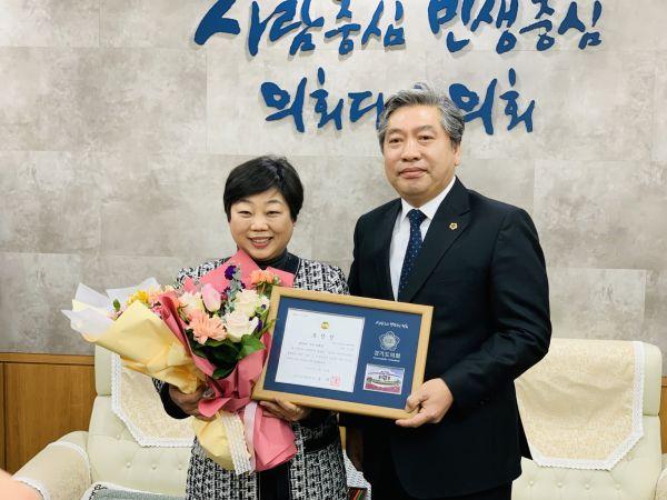 경기도의회 여성가족평생교육위원회 전승희의원은 26일 도의회 입법정책위원회에서 주관하는 의원발의 우수조례에 선정되어 도의회 의장 표창을 수상했다.