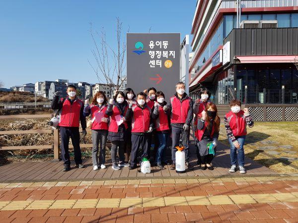 전국적으로 코로나19 확진자가 급증하며 주민들의 불안감이 커지는 가운데, 각 마을 통장들과 용이동 직원들이 합심해 버스승강장, 육교. 공원화장실 등 다중이용시설에 소독을 진행했다.