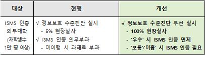 사용자 계정·권한 관리, 비밀번호·주민등록번호 암호화 적용, 인터넷망-내부망 분리 등 정보보호 수준진단 결과 ‘우수’ 등급 대학은 ISMS 인증을 받은 것으로 인정하며 기존 인증 완료 대학은 정보보호 수준진단 현장실사를 면제해 행정 부담이 줄어들 것으로 기대된다.