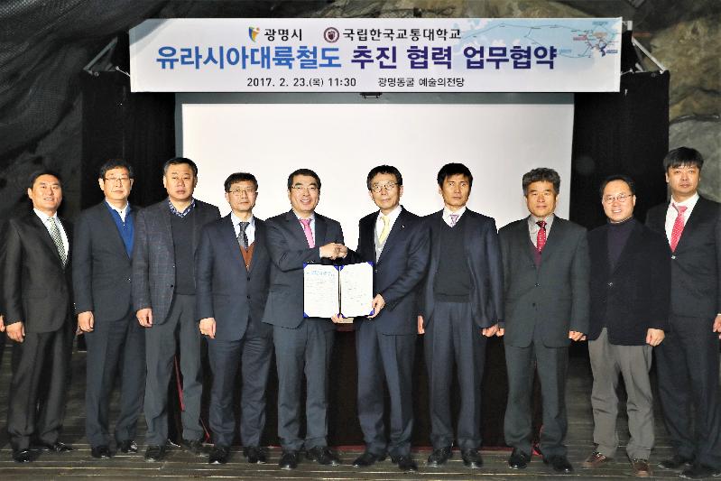 양기대 광명시장은 23일 광명동굴에서 김영호 국립한국교통대학교 총장과 업무협약을 체결하고 KTX광명역 활성화와 유라시아 대륙철도 추진을 위해 관·학 교류사업을 펼치기로 했다.