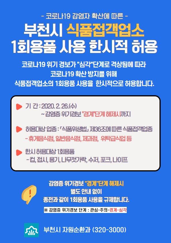 부천시가 코로나19 감염증 위기경보 단계가 경계에서 ‘심각’으로 격상됨에 따라 감염증 확산방지를 위해 시민 생활과 밀접한 일반음식점, 휴게음식점, 제과점 등 관내 11,638개 식품접객업소의 1회용품 사용을 한시적으로 허용한다.