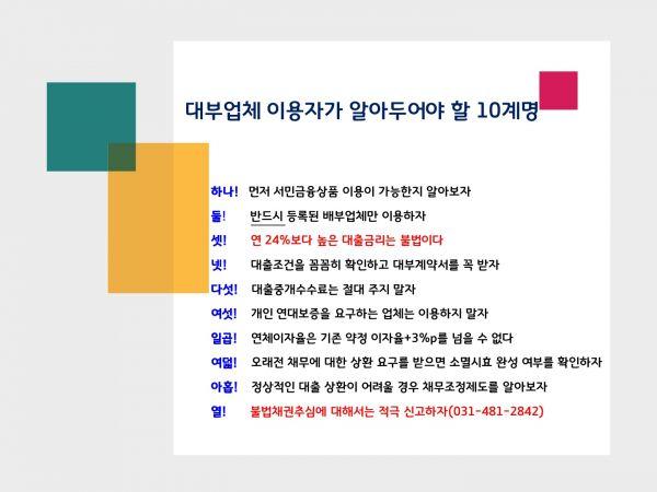 또 대부업 이용 10계명과 피해 사례집을 배포하는 한편 금융소비자 피해사례 상담, 무료 법률 지원, 금융 취약계층 교육 등이 함께 추진된다.