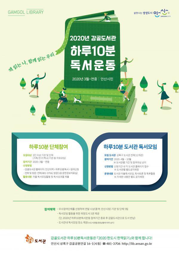 안산시 감골도서관은 함께 읽고 소통하며 좋은 책 문화를 만들어가기 위한 독서운동인 올해 ‘하루 10분 독서운동’을 다음 달부터 시작한다고 27일 밝혔다.