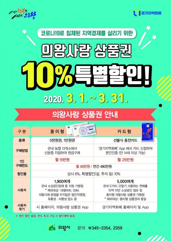 의왕시는 오는 3월 1일부터 31일까지 한 달 간 의왕사랑 상품권 10% 특별할인을 실시한다고 밝혔다.