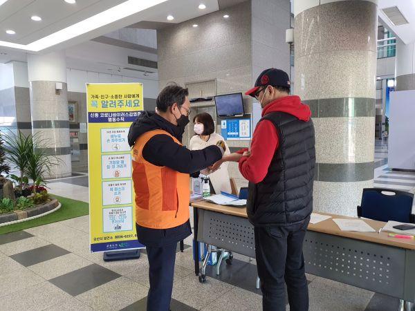 자원봉사센터 직원과 자원봉사자가 한조를 이뤄 오전9시부터 오후6시까지 시청사 출입구에서 민원인 등 출입자를 대상으로 발열체크와 손 소독을 실시하고 마스크 착용과 예방수칙을 홍보한다.