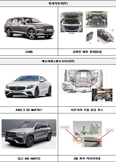 차종별 결함내용을 보면 AMG S 63 4MATIC+ Long 등 6개 차종 433대는 터보차저 오일 공급 호스의 재질 결함으로 엔진열에 의해 호스가 녹아 오일이 누유되고 엔진실의 고온 부품과 누유된 오일이 접촉될 경우 화재가 발생할 가능성, GLE 400 d 4MATIC 등 2개 차종 4대는 3열 좌석 머리지지대의 조정과 고정이 제대로 되지 않아 탑승자에게 상해를 입힐 가능성, AMG GT 63 4MATIC+ 등 2개 차종 2대는 자동변속기 배선을 고정하는 클립의 장착 위치 불량으로 자동변속기 배선이 손상되거나 절단되어 변속기가 작동되지 않을 가능성, AMG C 63 등 2개 차종 2대는 서스펜션 제어장치의 소프트웨어 오류로 차내에 무거운 하중이 실릴 경우 차량의 평행상태를 유지하지 못해 전조등 위치가 허용범위를 벗어나 맞은편 차량과 충돌할 가능성 등이다.