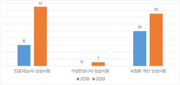 지난해 임상시험의 주요 특징은 인공지능과 가상현실 등 4차 산업혁명 기반 기술을 적용한 임상시험 확대 뇌질환을 개선하기 위한 다양한 임상시험 증가 등이다.