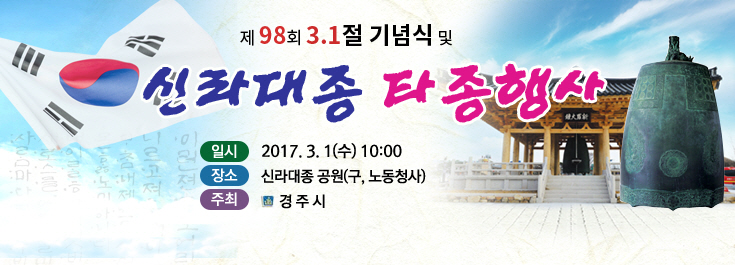 경주시(시장 최양식)는 3월 1일 오전 10시 신라대종공원에서 제98주년 3.1절을 기념하는 타종행사를 개최한다. 이번 삼일절 기념 신라대종 타종 행사는 독립운동에 헌신한 선열들의 숭고한 애국정신을 기리고, 3.1운동의 정신을 이어 받아 나라사랑하는 마음을 일깨워 주는 의미가 있을 뿐만 아니라, 지난해 성덕대왕신종(에밀레종·국보 제29호)의 모양과 크기, 소리와 종 표면에 새겨진 문양까지 똑같이 복원한 신라대종을 처음으로 시민과 함께 타종함으로써 경주의 새로운 도약과 시민의 평안을 기원하는 역사적인 장이 될 것으로 기대된다. 이날 기념식에는 식전행사로 신라대종 주조 영상물 상영과 퓨전국악 및 부채춤 등 식전공연에 이어 이상필 향교전교의 독립선언문 낭독과 최양식 경주시장과 김석기 국회의원의 삼일절 기념사와 경주시립합창단의 삼일절 기념노래가 울려 퍼지면 박승직 시의장의 선창에 따라 참석한 시민들이 대한독립만세 삼창을 한다. 이후 신라대종 기념타종에는 지역 인사, 기관사회단체장을 비롯해 정유년 닭띠해 출생자, 경주를 빛낸 시민과 군인‧경찰‧소방‧농축산업‧상인‧다문화가족 등 경주를 대표하는 각 부문별 198명이 6명씩 33조를 이뤄 나라사랑과 국태민안을 기원하는 33번의 종을 친다. 한편 기념타종 이후에는 참석한 시민들을 대상으로 ‘형상은 산이 솟은 듯하고 소리는 용의 소리 같았다’는 성덕대왕신종의 명문 표현을 몸소 실감할 수 있도록 공개타종 체험행사를 진행할 예정이다.