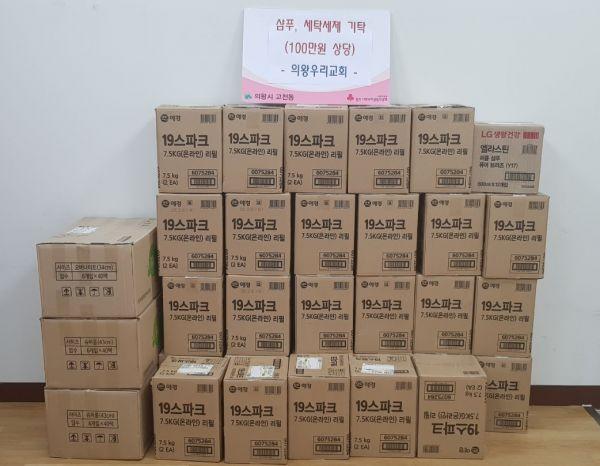 의왕시 고천동에 소재한 의왕우리교회에서 지난 27일 주변 어려운 이웃에게 전달해 달라며 100만원 상당의 세탁세제와 샴푸 등을 고천동주민센터에 전달했다.