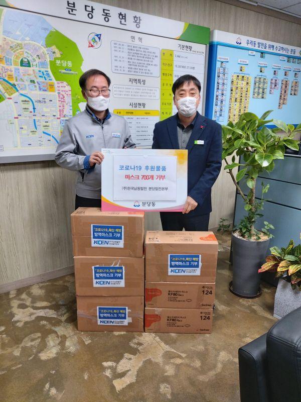 성남시 분당구 분당동에 소재한 ㈜한국남동발전 분당발전본부가 지난 27일 분당동 행정복지센터에 마스크 700매를 기탁했다.