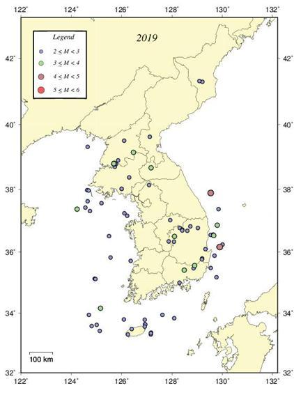 2019년 한반도 및 인근 해역에서 발생한 규모 2.0 이상의 지진은 총 88회로 2016년 이후 점차 줄어들고 있으나, 평균보다는 여전히 높은 특성을 보인다.