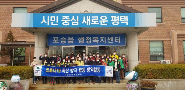 평택시 포승읍 행정복지센터는 28일 이장협의회, 주민자치위원회, 바르게살기위원회, 농업경영인회, 농촌지도자회 등 포승읍 19개 단체와 함께 코로나19 감염증 확산방지를 위한 합동 방역활동을 실시했다.