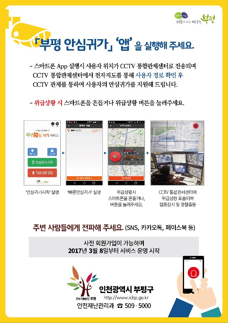 [미디어타임즈=문상수 기자] 부평구(구청장 홍미영)는 세계여성의 날인 3월 8일부터 여성들의 안전 귀가를 돕기 위한 ‘안심귀가 앱 서비스’를 운영한다.‘부평 안심귀가’ 앱 서비스란 부평구 관내에 설치된 CCTV와 모바일기기의 GPS(위치확인시스템)를 활용한 앱을 통해, 위급 상황에 처했을 때 스마트 폰을 흔들거나 위급 신호를 보내면 경찰이 바로 현장에 출동할 수 있는 시스템이다.부평구는 올해 통합관제센터 구축 사업을 완료, 기존에 용도별로 분리돼 있던 방범용 및 쓰레기 무단투기 단속용, 불법 주정차 단속용 등의 CCTV 카메라를 하나의 프로그램으로 통합 운영하고 있는 데 여기에 안심귀가 서비스를 추가하는 것이다. 부평구민 누구나 ‘부평 안심귀가 앱’을 다운로드 해 회원에 가입한 후 실행하면 사용자 위치가 CCTV 통합관제센터로 전송돼 관제센터에서 실시간 모니터링에 돌입, 안심 귀가를 지원 받을 수 있다.사용자가 위기에 처했을 때 스마트폰을 3~4회 힘껏 흔들면 경찰 순찰차가 출동한다. 안심귀가 앱 서비스는 인천시에서 부평구가 처음으로 도입하는 것이다서비스 가입을 위해서는 플레이스토어(안드로이드) 또는 앱스토어(아이폰)에서 ‘부평 안심귀가’를 검색해 안내에 따르면 된다.