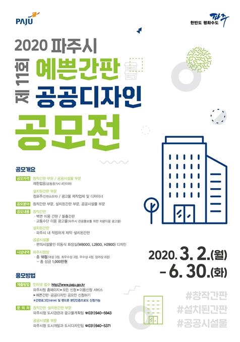 파주시는 도시 경관 조성에 기여할 수 있는 옥외광고물 및 공공디자인 발굴을 위한 ‘제11회 파주시 예쁜간판·공공디자인 공모전’을 개최한다고 2일 밝혔다.
