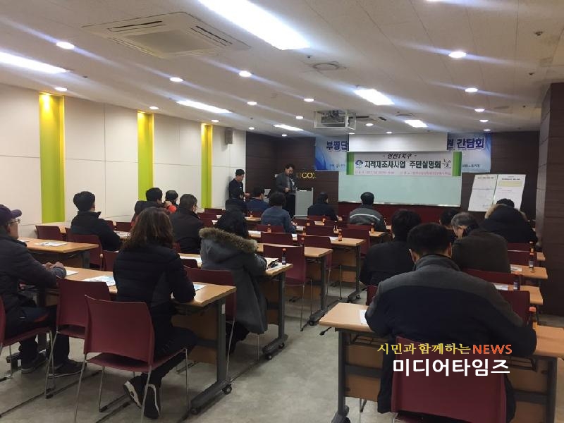 | 한국산업단지공단 부평사무소에서 청천1지구 지적재조사사업지구 토지소유자 및 이해관계인 50여명이 참석한 가운데 ‘지적재조사사업 주민설명회’를 하는모습. <ⓒ미디어타임즈> |