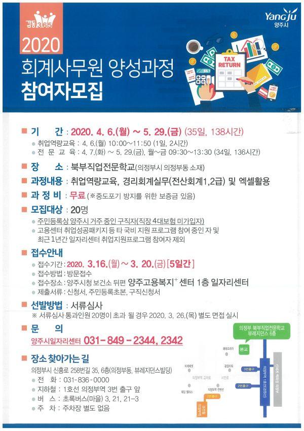 양주시일자리센터는 오는 16일부터 20일까지 2020년 취업지원프로그램인 ‘회계사무원 양성과정’ 참여자를 모집한다.