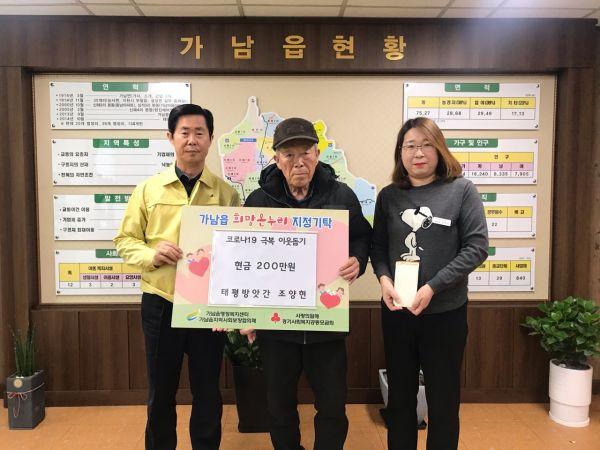 지난달 28일 가남읍의 태평방앗간 조양현씨는 코로나19 확산방지와 감염에 취약한 이웃을 돕기위해 가남읍에 현금 200만원을 기탁했다.