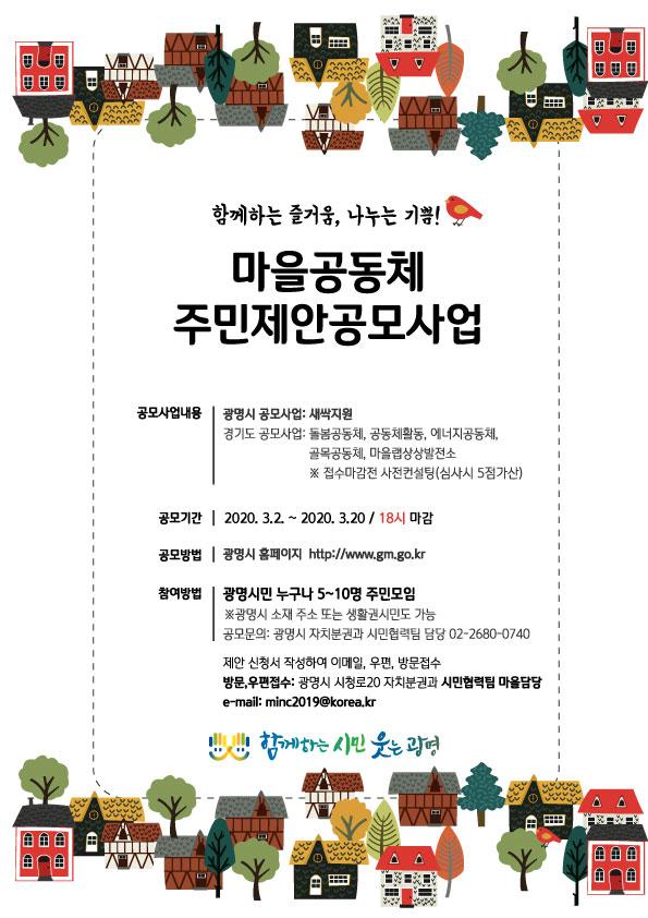 광명시는 이웃과 더불어 살아가는 마을공동체를 회복하고 시민들이 마을의 문제를 스스로 해결해 나갈 수 있도록 도움을 주고자 ‘2020년 마을공동체 주민제안사업’을 추진하며 사업 참여자를 오는 20일까지 모집한다.