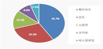횡단보도에 이어 불법 주·정차 주민신고가 많이 접수된 지역으로는 인도 29.5%, 소화전 15.2%, 교차로 8.8% 버스정류장 5.5% 순이었다.