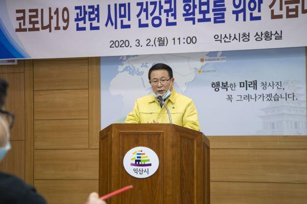 이 밖에도 정헌율 시장은 대구, 경북에서 제대로 검사를 받지 못하고 치료 병실이 부족한 현상 때문에 전북 등 청정지역으로 이동해 검사를 받는 경우에 대비해 정부에 방역망 구축을 위한 대책을 촉구하기도 했다.