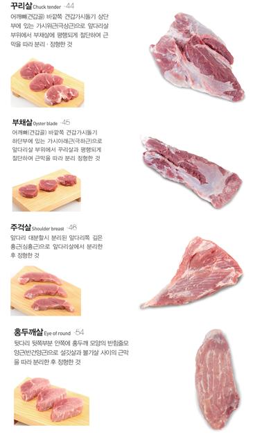 이번에 소개하는 부위는 돼지 앞다리의 ‘꾸리살’, ‘부채살’, ‘주걱살’과 뒷다리의 ‘홍두깨살’이다.