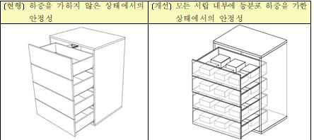 모든 서랍장이 열린 상태에서의 안정성 시험은 기존에 빈 서랍이 열린 상태에서 전도 여부를 확인했으나, 실제 사용 시 서랍 내에 의류 등을 적재하고 사용하는 점을 감안해 서랍 내에 하중을 가한 상태에서 전도 여부를 확인하도록 했다.