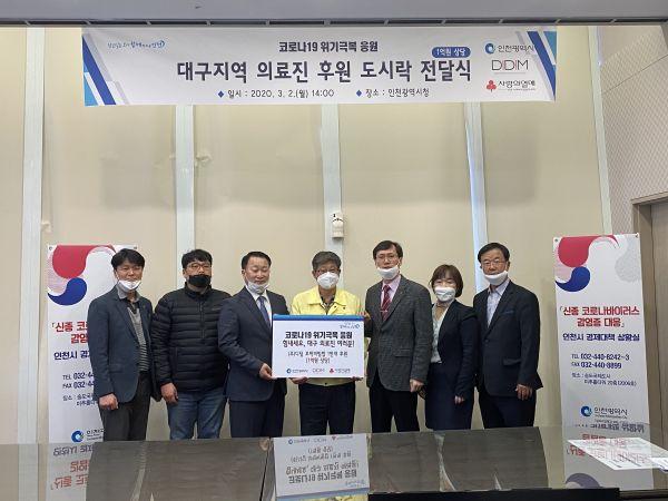 인천시는 ㈜디딤과 코로나19 확산으로 어려움을 겪고 있는 대구지역의 의료진 및 자원봉사자들에게 도시락 1만개를 지원하기 위해 김상섭 인천시 일자리경제본부장, ㈜디딤 김현선 부대표, 이정윤 인천사회복지공동모금회 사무처장이 참석한 가운데 인천 송도 미추홀타워에서 3월 2일 오후에 전달식을 가졌다고 밝혔다.