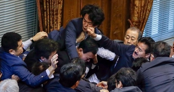 | 일본 여당이 18일 위헌 논란에 휩싸인 '집단 자위권 법안'(안보 관련 11개 법률 제·개정안·안보 법안)을 참의원 특별위원회에서 강행 처리하면서 여야의원간에 몸싸움이 벌어지고 있다. |