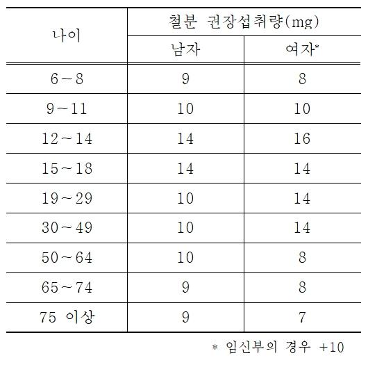 철분은 혈액 내 헤모글로빈을 구성하는 필수 영양 성분이지만 연령대 별로 권장 섭취량에 차이가 있으며 우리나라는 성장기 청소년과 여성, 임산부가 철분 섭취가 부족한 것으로 알려져 있다.