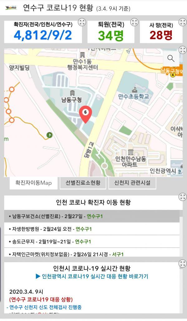 연수구가 확진환자 이동 동선과 선별진료소, 신천지관련 시설 등을 모바일로 한눈에 확인할 수 있는 ‘연수구 코로나19 현황지도’를 자체 제작해 서비스를 시작했다.