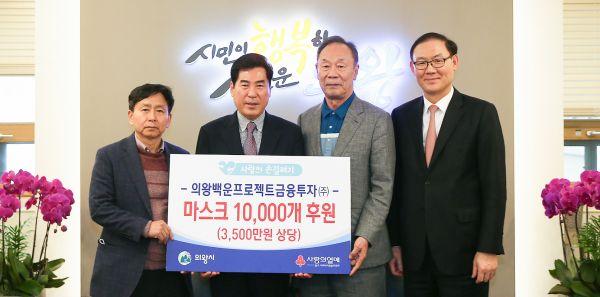 의왕시는 지난 3일 의왕백운프로젝트금융투자에서 코로나19로 어려움을 겪고 있는 취약계층을 위해 사용해 달라며 마스크 1만개를 기탁했다고 밝혔다.